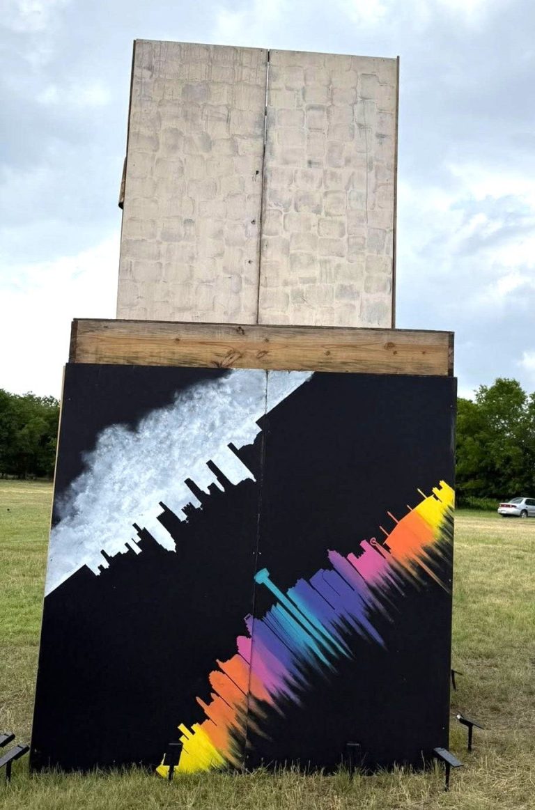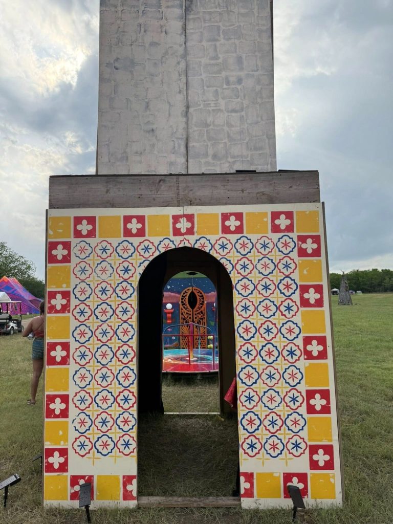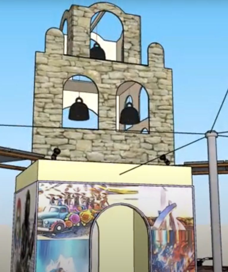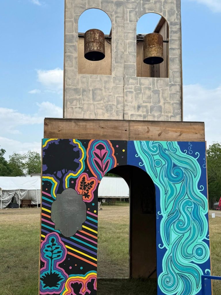When the nearby merry-go-round spins, the 3 large mission bells ring, sending their message across the playa. At night, spotlights projected inside the mission make it appear to glow from within, casting a mesmerizing blend of shadows and lights onto the moving bells. This interactive feature invites viewers to engage with the artwork, providing an opportunity to experience the vitality of the city's history, deeply intertwined with the soul of San Antonio.