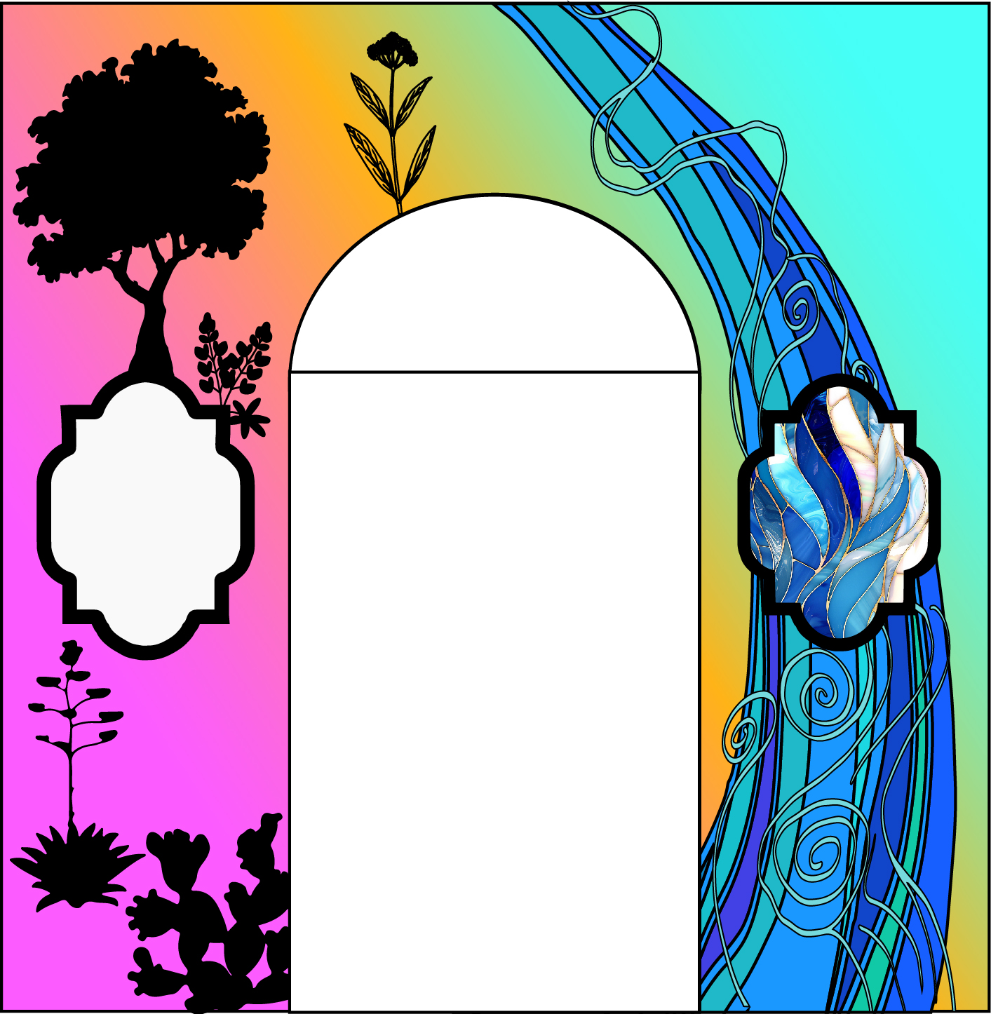 The installation revolves around a representation of Spanish colonial missions that transformed the region in the 1700s. These missions mark the beginning of the melding of cultures that is still a defining characteristic of modern San Antonio. The theme of this art piece visually represents San Antonio's rich history, renowned for housing the oldest buildings in Texas.