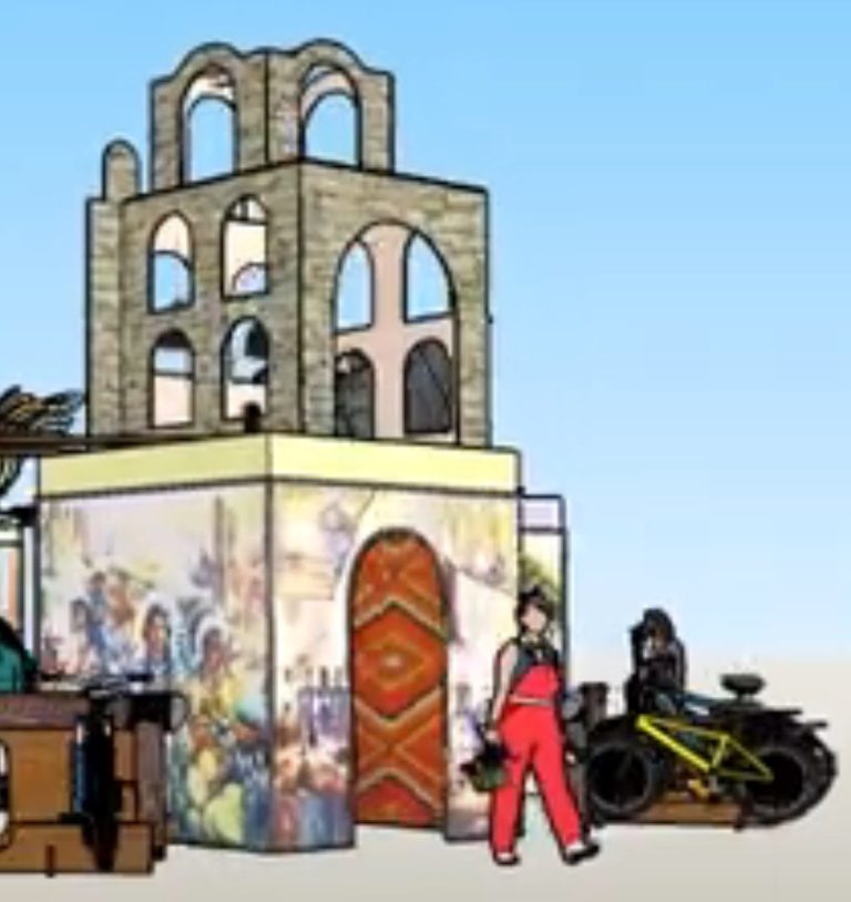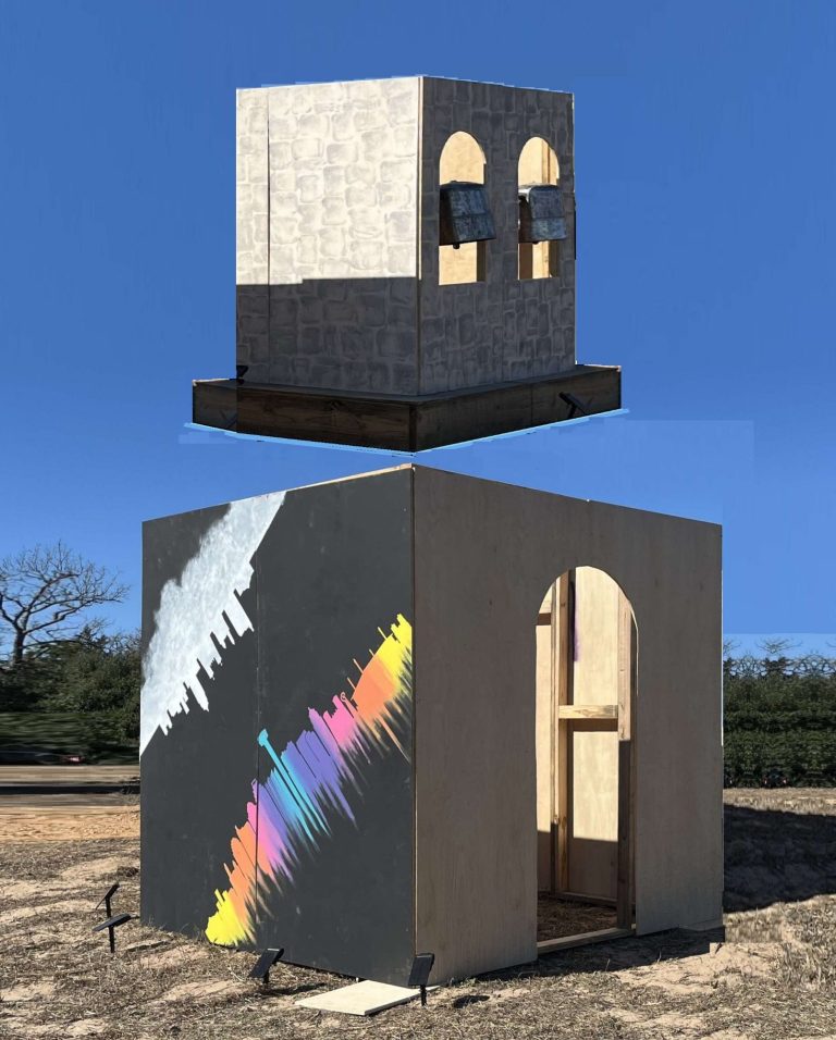 When the nearby merry-go-round spins, the 3 large mission bells ring, sending their message across the playa. At night, spotlights projected inside the mission make it appear to glow from within, casting a mesmerizing blend of shadows and lights onto the moving bells. This interactive feature invites viewers to engage with the artwork, providing an opportunity to experience the vitality of the city's history, deeply intertwined with the soul of San Antonio.